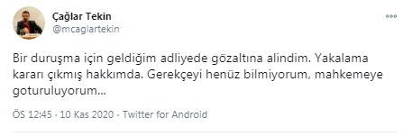Gözaltına alınan Çağlar Tekin daha sonra, savcılıktaki ifadesinin ardından serbest bırakıldı. Tekin, paylaşımında şöyle yazdı: