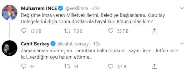 Sanatçı Cahit Berkay, İnce’nin Twitter üzerinden yaptığı açıklamasına “zamanla muhteşem” diye yanıt verdi. Berkay devamında, "Umutlara balta olursun... Sayın İnce... Lütfen ince kal... Verdiğim oyu haram ettirme" dedi.