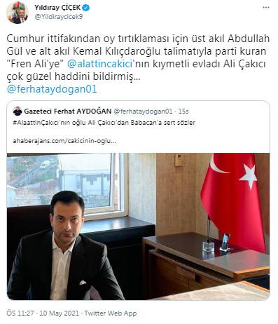 Ali Çakıcı'nın açıklamasını MHP Genel Başkanı Devlet Bahçeli'nin danışmanı Yıldıray Çiçek'in de Twitter hesabından "Cumhur ittifakından oy tırtıklaması için üst akıl Abdullah Gül ve alt akıl Kemal Kılıçdaroğlu talimatıyla parti kuran "Fren Ali'ye" Alaattin Çakıcı'nın kıymetli evladı Ali Çakıcı çok güzel haddini bildirmiş..." ifadeleriyle destek vererek paylaştığı görüldü.
