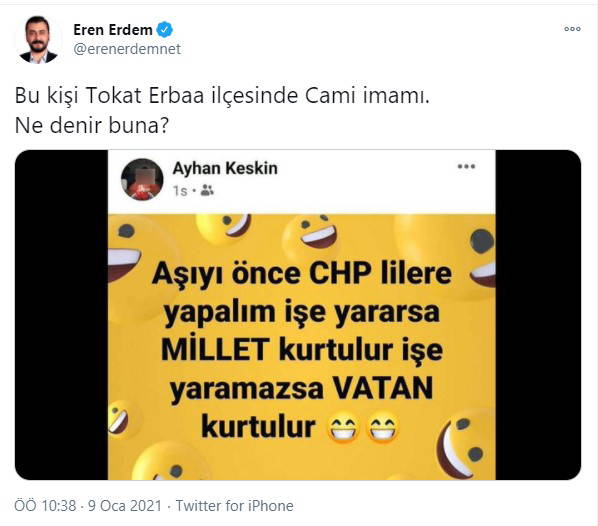 CHP Parti Meclis Üyesi Eren Erdem, Tokat'ın Erbaa ilçesinde cami imamlığı yapan Ayhan Keskin'in aşı ile ilgili skandal mesajını paylaştı. Keskin mesajında, "Aşıyı önce CHP'lilere yapalım; işe yararsa millet kurtulur, işe yaramazsa vatan kurtulur" ifadelerini kullandı.