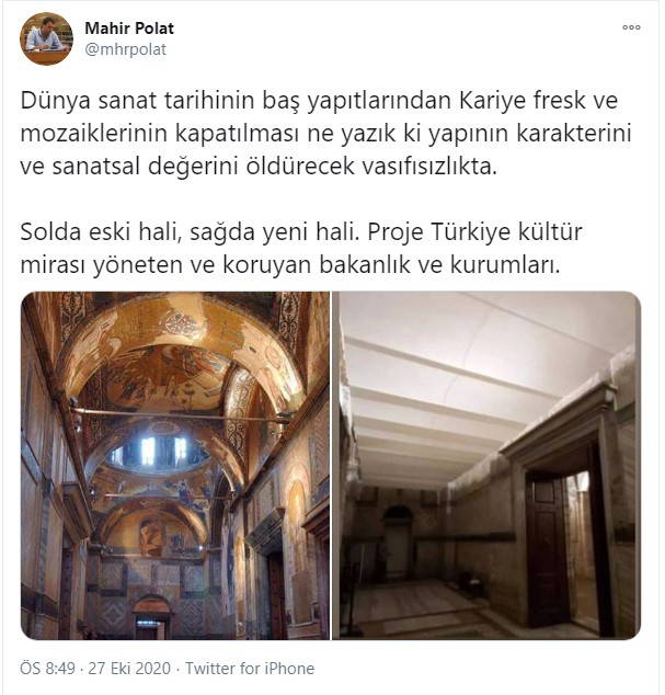 ''Dünya sanat tarihinin baş yapıtlarından Kariye fresk ve mozaiklerinin kapatılması ne yazık ki yapının karakterini ve sanatsal değerini öldürecek vasıfısızlıkta. Solda eski hali, sağda yeni hali. Proje Türkiye kültür mirası yöneten ve koruyan bakanlık ve kurumları.''