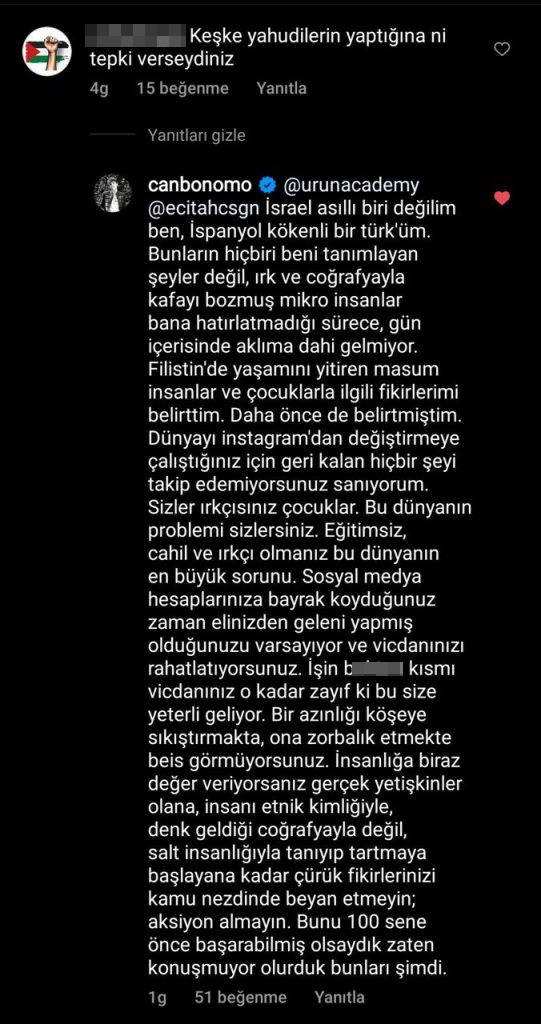 Can Bonomo gelen ırkçı yorum karşısında sessizliğini bozarak, “Israil asıllı biri değilim ben, İspanyol kökenli bir Türk’üm. Bunların hiçbiri beni tanımlayan şeyler değil, ırk ve coğrafyayla kafayı bozmuş mikro insanlar bana hatırlamadığı sürece, gün içerisinde aklıma dahi gelmiyor. Filistin’de yaşamını yitiren masum insanlar ve çocuklarla ilgili fikirlerimi belirttim. Daha önce de belirtmiştim. Dünyayı Instagram’dan değiştirmeye çalıştığınız için geri kalan hiçbir şeyi takip edemiyorsunuz sanıyorum. Sizler ırkçısınız çocuklar. Bu dünyanın problemi sizlersiniz. Eğitimsiz, cahil ve ırkçı olmanız bu dünyanın en büyük sorunu. Sosyal medya hesaplarında bayrak koyduğunuz zaman elinizden geleni yapmış olduğunuzu varsayıyor ve vicdanınızı rahatlatıyorsunuz. İşin b…ktan kısmı vicdanınız o kadar zayıf ki bu size yeterli geliyor. Bir azınlığı köşeye sıkıştırmakta, ona zorbalık etmekte beis görmüyorsunuz. İnsanlığa biraz değer veriyorsanız gerçek yetişkiler olana, insanı etnik kimliğiyle, denk geldiği coğrafyayla değil, salt insanlığıyla tanıyıp tartmaya başlayana kadar çürük fikirlerinizi kamu nezdinde beyan etmeyin; aksiyon almayın. Bunu 100 sene önce başarabilmiş olsaydık zaten konuşmuyor olurduk bunları şimdi” ifadelerini kullandı.