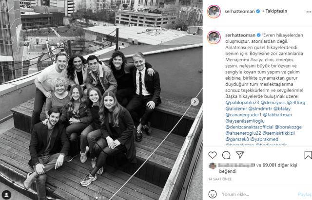 Canan Ergüder'le birlikte diziye veda eden Serhat Teoman, Instagram hesabından setteki son gününde çekilen kareleri paylaşarak "Evren hikayelerden oluşmuştur, atomlardan değil. Anlatması en güzel hikayelerdendi benim için. Böylesine zor zamanlarda Menajerimi Ara'ya elini, emeğini, sesini, nefesini büyük bir özveri ve sevgiyle koyan tüm yapım ve çekim ekibine, birlikte oynamaktan gurur duyduğum tüm meslektaşlarıma sonsuz teşekkürlerim ve sevgilerimle! Başka hikayelerde buluşmak üzere" dedi.