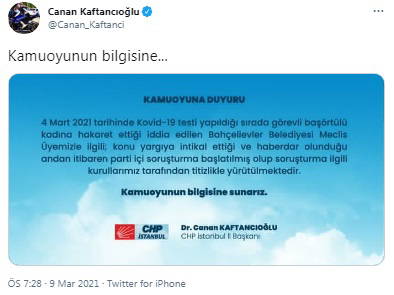 "4 Mart 2021 tarihinde Covid-19 testi yapıldığı sırada görevli başörtülü kadına hakaret ettiği iddia edilen Bahçelievler Belediyesi Meclis Üyemizle ilgili, konu yargıya intikal ettiği ve haberdar olunduğu andan itibaren parti içi soruşturma başlatılmış olup, soruşturma ilgili kurullarımız tarafından titizlikle yürütülmektedir."