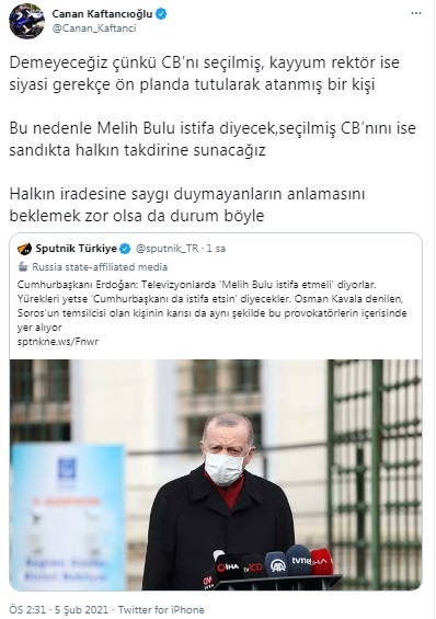"Demeyeceğiz çünkü cumhurbaşkanı seçilmiş, kayyum rektör ise siyasi gerekçe ön planda tutularak atanmış bir kişi. Bu nedenle 'Melih Bulu istifa' diyecek, seçilmiş cumhurbaşkanını ise sandıkta halkın takdirine sunacağız. Halkın iradesine saygı duymayanların anlamasını beklemek zor olsa da durum böyle"