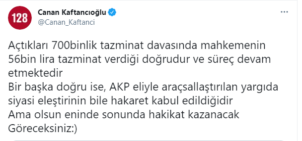 Konuya ilişkin sosyal medya hesabından açıklama yapan CHP'li Kaftancıoğlu, "Açtıkları 700 binlik tazminat davasında mahkemenin 56 bin lira tazminat verdiği doğrudur ve süreç devam etmektedir." açıklaması yaptı.