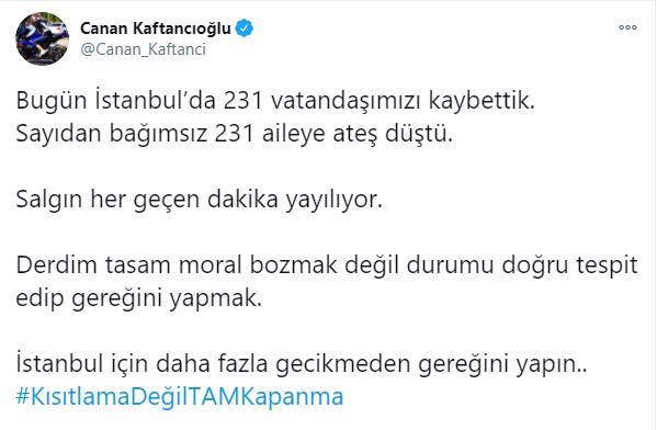 Kaftancıoğlu, "Bugün İstanbul’da 231 vatandaşımızı kaybettik. Sayıdan bağımsız 231 aileye ateş düştü. Salgın her geçen dakika yayılıyor. Derdim tasam moral bozmak değil durumu doğru tespit edip gereğini yapmak. İstanbul için daha fazla gecikmeden gereğini yapın.. #KısıtlamaDeğilTAMKapanma" ifadelerini kullandı.