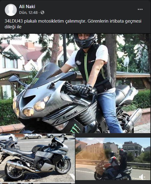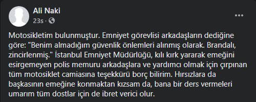 "Motosikletim bulunmuştur. Emniyet görevlisi arkadaşların dediğine göre: 'Benim almadığım güvenlik önlemleri alınmış olarak. Brandalı, zincirlenmiş.' İstanbul Emniyet Müdürlüğü, kılı kırk yararak emeğini esirgemeyen polis memuru arkadaşlara ve yardımcı olmak için çırpınan tüm motosiklet camiasına teşekkürü borç bilirim. Hırsızlara da başkasının emeğine konmaktan kızsam da, bana bir ders vermeleri umarım tüm dostlar için de ibret verici olur."