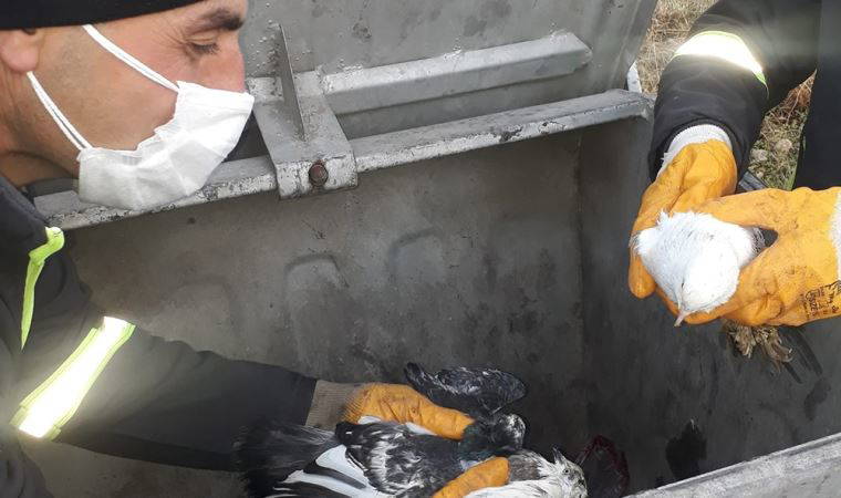 Çöp konteynerinin içinde poşetle bağlanmış 3 adet güvercin gören işçiler gözlerine inanamadı.