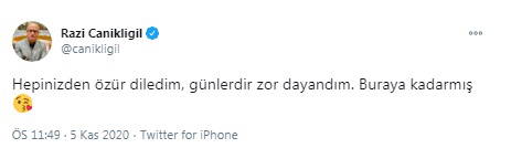 Canikligil daha sonra tweet atarak, "Hepinizden özür diledim, günlerdir zor dayandım. Buraya kadarmış" ifadelerini kullandı.