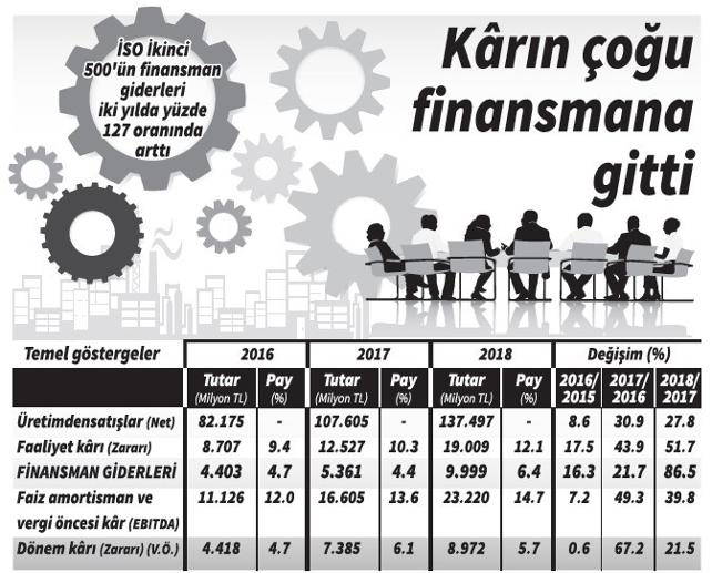 Türkiye’nin ikinci 500 büyük sanayi kuruluşunun (İSO İkinci 500) faiz giderleri 2018’de bir önceki yıla göre yüzde 86.5 artışla 9 milyar 999 milyon TL’ye yükseldi. 2017’de İSO İkinci 500 şirketleri, toplam faaliyet kârlarının yüzde 42.8’ini finansman giderlerine harcarken bu oran 2018’de yüzde 52.6’ya yükseldi. 2018’de İSO Birinci 500’ün finansman giderleri yüzde 172 artarak 35.1 milyar TL’den 95.8 milyar TL’ye çıkarken, her 100 TL’lik faaliyet kârının 88.9 TL’si borç geri ödemelerine gitmişti.
