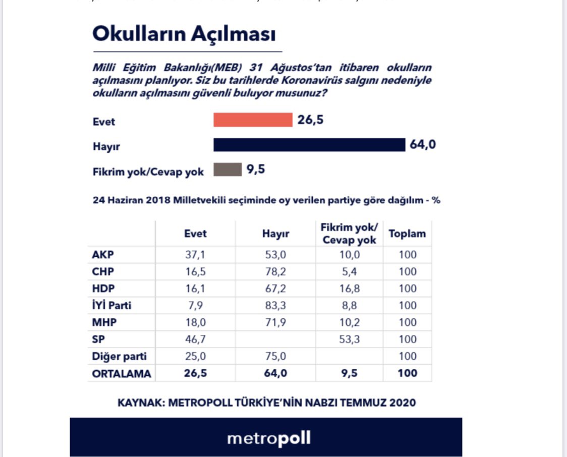 MetroPOLL Araştırma yurttaşlara "31 Ağustosta okulların açılmasını planlanıyor. Siz bu tarihlerde koronavirüs salgını nedeniyle okulların açılmasını güvenli buluyor musunuz?" diye sordu.