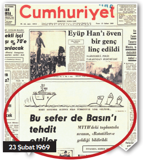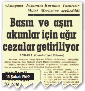 Elbette Amerika’nın Türkiye’yi “Küçük Amerika” yapma taktiklerinin eşliği hamleler hiç eksilmiyor.. 1969’un şubatında, her seçim sonrası iktidar erkini kullanmada daha bir güçlenmiş Demirel iktidarının yeni taktik hamlesi; “Anayasa Nizamını Koruma Tasarısı” başlığı altında 15 Şubat günlü Cumuhuriyet’in birinci sayfasındaki yerini alıyor. 23 Şubat günlü gazetemizde ise Türk-İslam sentezli kimliği, Sünni İslam ağırlıklı olarak kaydırılmış MTTB’nin çıkış desteğinde basın hedef tahtasında.. Meclis’e verilen yasa tasarısında basın ve aşırı akımlar gerekçeli ağır cezaların getirilmesi gündemde. 141- 142-163 üzerinden cezaların artırılması öngörülüyor.