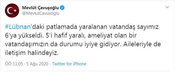 Bakan Çavuşoğlu, sosyal paylaşım sitesi Twitter'daki hesabından yaptığı açıklamada, "Lübnan’daki patlamada yaralanan vatandaş sayımız 6’ya yükseldi. 5’i hafif yaralı, ameliyat olan bir vatandaşımızın da durumu iyiye gidiyor. Aileleriyle de iletişim halindeyiz" dedi.