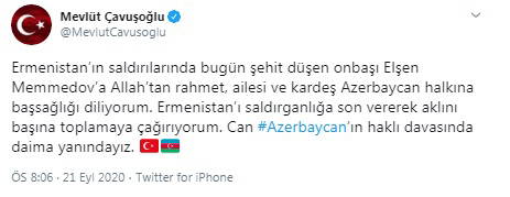 "Ermenistan’ın saldırılarında bugün şehit düşen onbaşı Elşen Memmedov’a Allah’tan rahmet, ailesi ve kardeş Azerbaycan halkına başsağlığı diliyorum. Ermenistan’ı saldırganlığa son vererek aklını başına toplamaya çağırıyorum. Can #Azerbaycan’ın haklı davasında daima yanındayız.”