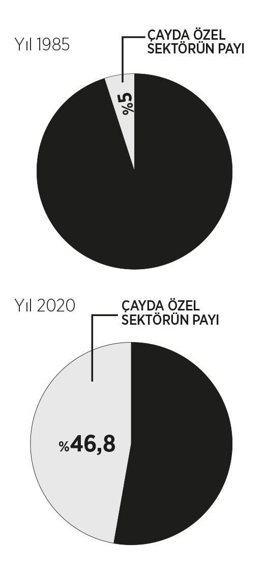 Çay üretiminde özel şirketlerin payı giderek artıyor. 1985 yılında sektördeki toplam yaş çay alımının yüzde 95’i ÇAYKUR, yüzde 5’i özel sektör tarafından yapılırken yıllar içinde çokuluslu şirketlerin eline geçmeye başladı. 2020 yılına geldiğimizde ise toplam yaş çayın yüzde 53,2’si ÇAYKUR, yüzde 46,8’i ise özel sektör tarafından alındı.