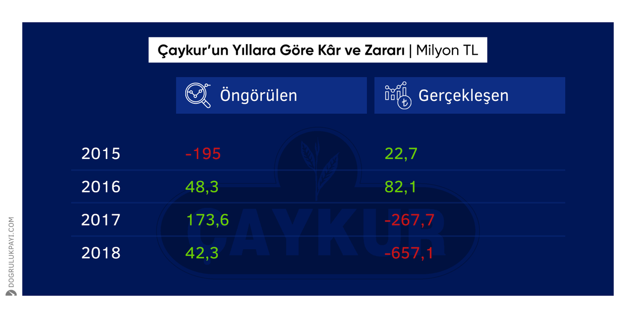 Doğruluk Payı'nın aktardığına göre Çaykur’un yıllık faaliyet raporlarında açıkladığı gelir tablolarına bakıldığında; şirket, varlık fonuna devredilmeden önce 2015 ve 2016 yılında öngörülenin üstünde kâr ettiği görülmektedir. 2015 yılında 195 milyon TL zarar öngören şirket, yıl sonunda 22,7 milyon TL kâr ederken, 2016 yılı programında 48,3 milyon TL kâr öngörüp, yıl sonunda 82,1 milyon TL kâr açıkladı.