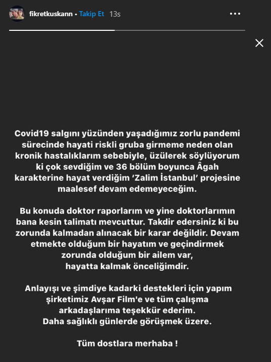 Instagram hesabının 'hikaye' bölümünde bir açıklama yayımlayan Kuşkan, "Covid19 salgını yüzünden yaşadığımız zorlu pandemi sürecinde, hayati riskli gruba girmeme neden olan kronik hastalıklarım sebebiyle, üzülerek söylüyorum ki çok sevdiğim ve 36 bölüm boyunca Agah karakterine hayat verdiğim Zalim İstanbul projesine maalesef devam edemeyeceğim" dedi.