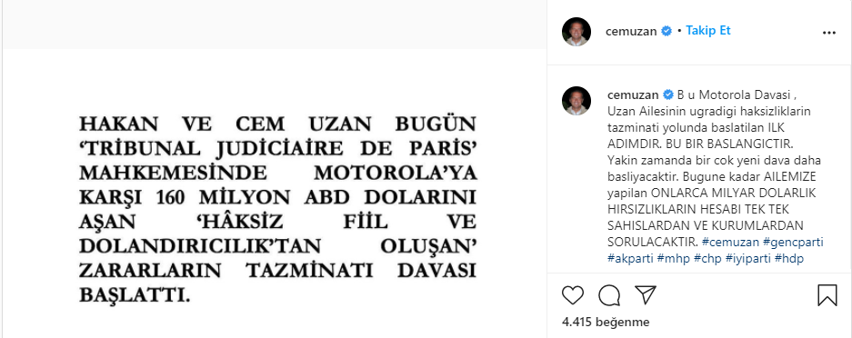 Konuyla ilgili açıklama yapan Cem Uzan, “Bu Motorola Davası Uzan ailesinin uğradığı haksızlıkların tazminatı yolunda başlatılan İLK adımdır. Bu bir başlangıçtır. Yakın zamanda birçok yeni davayı başlatmak üzere son hazırlıklar tamamlanmaktadır. Bugüne dek ailemize karşı yapılmış onlarca milyar doları asan hırsızlıkların hesabi teker teker şahıslardan ve kurumlardan sorulacaktır” ifadelerini kullandı.