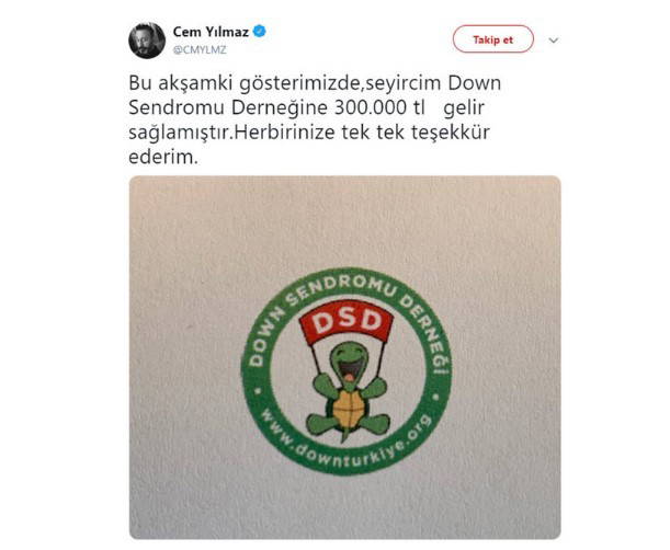 Başarılı komedyen, gösterisinin geliriyle bağışta bulunduğunu belirterek, "Bu akşamki gösterimizde, seyircim Down Sendromu Derneği'ne 300 bin TL gelir sağlamıştır. Her birinize tek tek teşekkür ederim" ifadelerini kullandı.