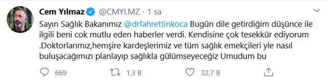 Yılmaz, yaptığı paylaşımda, "Sayın Sağlık Bakanımız Fahrettin Koca, Bugün dile getirdiğim düşünce ile ilgili beni çok mutlu eden haberler verdi. Kendisine çok teşekkür ediyorum. Doktorlarımız, hemşire kardeşlerimiz ve tüm sağlık emekçileriyle nasıl buluşacağımızı planlayıp sağlıkla gülümseyeceğiz. Umudum bu" ifadelerini kullandı.