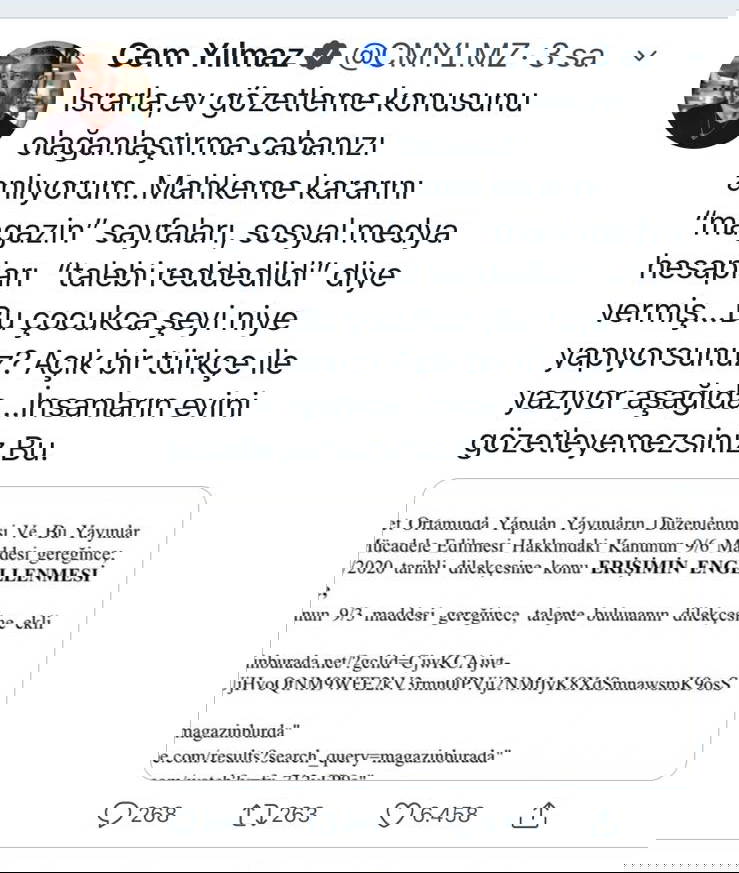"Israrla, ev gözetleme konusunu olağanlaştırma çabanızı anlıyorum. Mahkeme kararını 'magazin' sayfaları, sosyal medya hesapları 'talebi reddedildi' diye vermiş. Bu çocukça şeyi niye yapıyorsunuz? Açık bir Türkçe ile yazıyor aşağıda. İnsanların evini gözetleyemezsiniz."