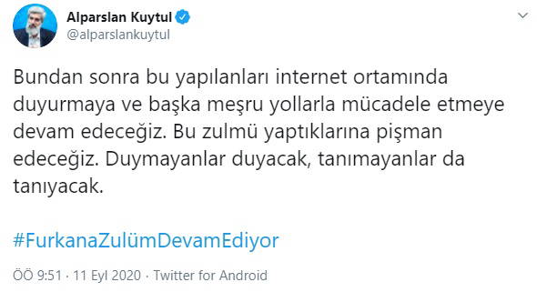 "Bundan sonra bu yapılanları internet ortamında duyurmaya ve başka meşru yollarla mücadele etmeye devam edeceğiz. Bu zulmü yaptıklarına pişman edeceğiz. Duymayanlar duyacak, tanımayanlar da tanıyacak."