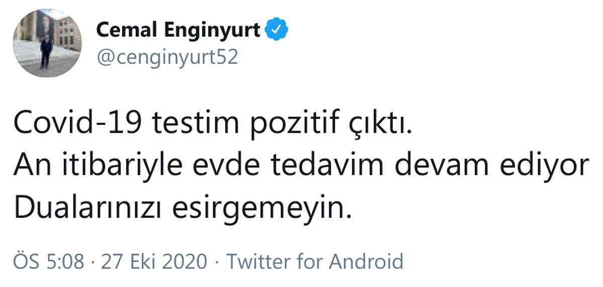 Koronavirüs testi sonucunun pozitif çıktığını duyuran Enginyurt, sosyal medya hesabından yaptığı açıklamada “Covid-19 testim pozitif çıktı. An itibariyle evde tedavim devam ediyor. Dualarınızı esirgemeyin” ifadelerini kullandı.