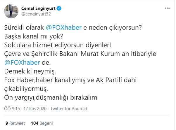 Kendisini eleştirenlere, " 'Sürekli olarak FOX Haber'e neden çıkıyorsun, başka kanal mı yok, solculara hizmet ediyorsun' diyenler" şeklinde seslenen Enginyurt, sözlerini şöyle sürdürdü: