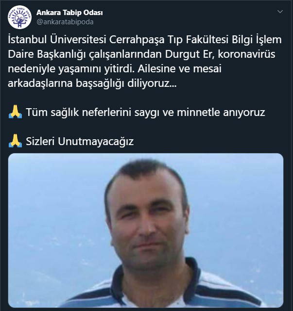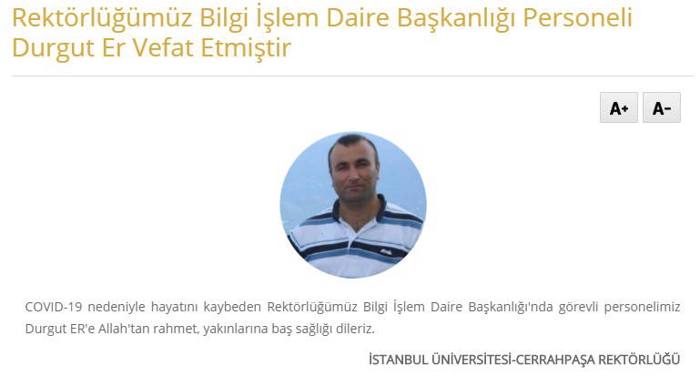 İstanbul Üniversitesi Cerrahpaşa Rektörlüğü'nden yapılan açıklamada “Covid-19 nedeniyle hayatını kaybeden rektörlüğümüz Bilgi İşlem Daire Başkanlığı’nda görevli personelimiz Durgut Er’e Allah’tan rahmet, yakınlarına başsağlığı dileriz” denildi.