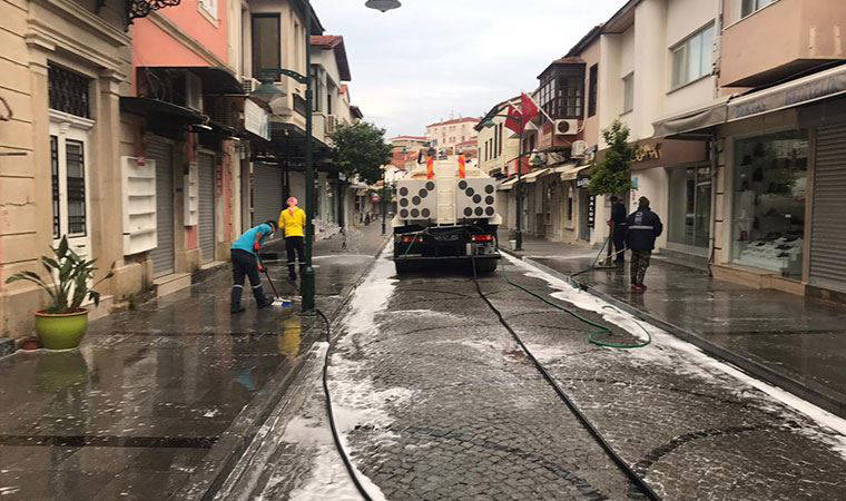 Çeşme Belediyesi koronavirüs tedbirleri kapsamında, ilçe genelindeki cadde ve sokakları solüsyonlu su ile yıkayarak, çöp konteynırlarını dezenfekte ediyor. Belediyenin hijyen konusunda çalışmalarını eksiksiz sürdürdüğünü dile getiren ÇeşmeBelediyeBaşkanı M.Ekrem Oran, “Koronavirüs ile mücadelemiz devam ediyor. Tüm mahallelerimizi ilaçlı su ile baştan aşağı temizliyoruz. Çeşmeli hemşerilerimizin sağlığını korumaya yönelik önlemler almaya devam edeceğiz. Vatandaşlarımızdan isteğimiz evde kalarak kendilerini ve sevdiklerinizi korumaya devam etmesi.Bu zor günleri hep birlikte atlatacağız.Biz sokaklardayız, sizlerin sağlığı için Çeşme’nin bütün sokaklarını cdezenfekte ediyoruz” diye konuştu.