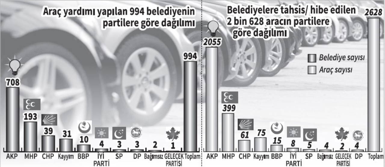 Çevre ve Şehircilik Bakanlığı’nın belediyelere araç ve nakdi yardım yapma yetkisini kullanırken Cumhur İttifakı belediyelerine ayrımcılık uyguladığı anlaşıldı. Bakanlık, son 3 yılda 994 belediyeye, 2 bin 628 araç yardımında bulundu. 708 AKP’li belediyeye 2 bin 55, 193 MHP’li belediyeye 399 araç verilirken, 247 CHP’li belediyenin 39’una 61 araç gönderildi. Buna göre bakanlık, araç yardımlarının yüzde 97’sini Cumhur İttifakı ve kayyum atanan belediyelere, yüzde 3’ünü ise muhalefet partilerindeki belediyelere gönderdi. Konya’daki AKP-MHP belediyelerine 165 araç verilirken, muhalefetteki tüm belediyelere gönderilen araç sayısı 80’de kaldı.