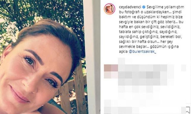 Ünlü oyuncu Ceyda Düvenci sosyal medya hesabı üzerinden eşi Bülent Şakrak'a yolladığı bir karesini altına düştüğü romantik bir not le paylaştı.