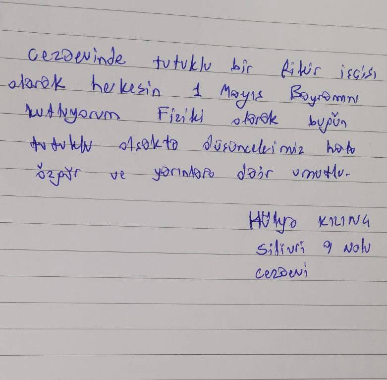 “Cezaevinde tutuklu bir fikir işçisi olarak herkesin 1 Mayıs bayramını kutluyorum” diyen Hülya Kılınç da, “Fiziki olarak bugün tutuklu olsak da düşüncelerimiz hala özgür ve yarınlara dair umutludur” mesajını gönderdi.