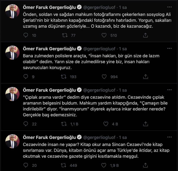 “Cezaevinde insan ne yapar? Kitap okur ama Sincan Cezaevi’nde kitap sınırlaması var. Dünya, kitabın önünü açar ama Türkiye’de iktidar, az kitap okutmak ve cezaevine gazete girişini kısıtlamakla meşgul.