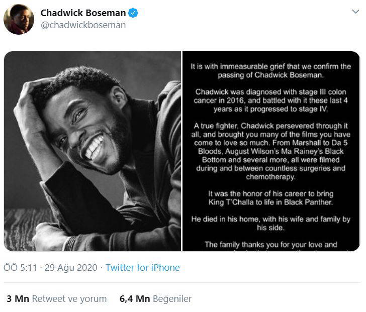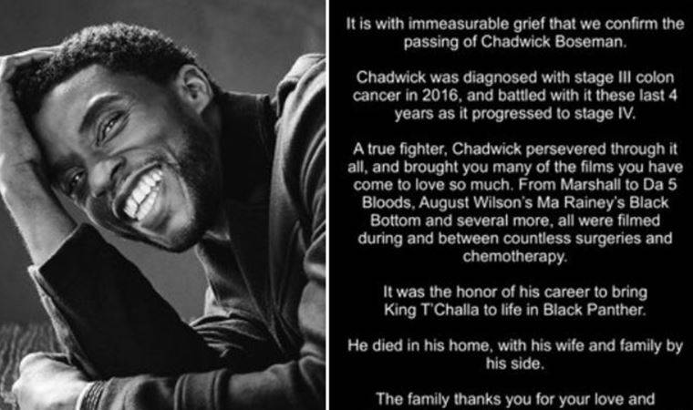 Black Panther filminin yıldızı 43 yaşındaki Chadwick Boseman dün kolon kanseri nedeniyle yaşamını yitirdi.