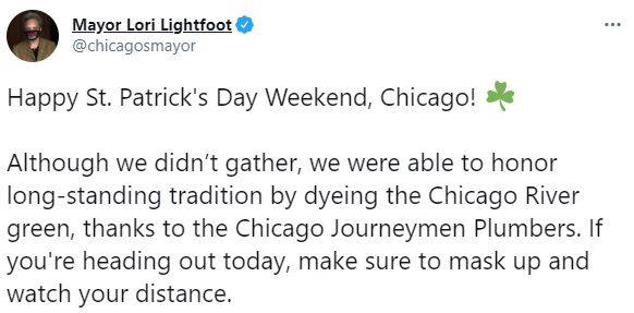 Chicago Belediye Başkanı Lori Lightfoot sosyal medya hesabından yaptığı açıklamada, “Bir araya gelmesek de Chicago Nehri’ni yeşile döndürerek uzun süredir devam eden geleneği sürdürebildik. Bugün dışarı çıkıyorsanız, maske taktığınızdan ve mesafeye dikkat ettiğinizden emin olun” ifadelerini kullandı.