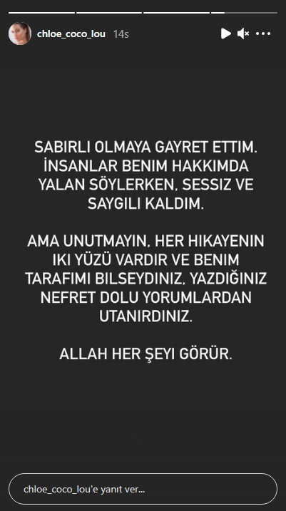 Instagram hesabından Ortaç'ın sözlerine yanıt veren Loughnan, "Sabırlı olmaya gayret ettim. İnsanlar benim hakkımda yalan söylerken sessiz ve saygılı kaldım. Her hikayenin iki yüzü vardır. Benim tarafımı bilseydiniz yazdığınız nefret dolu yorumlardan utanırdınız. Allah her şeyi görür" paylaşımını yaptı.