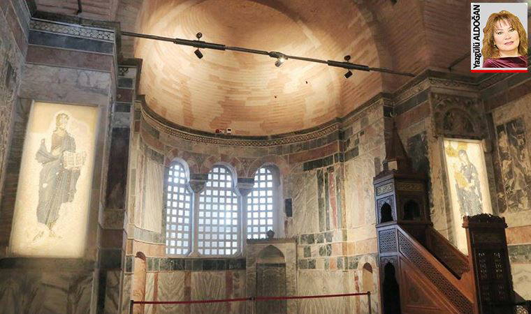 İbadet edilecek yerde en fazla 30-40 kişi namaz kılabilir. Burada da sadece üç fresk var. Rehber arkadaşım adeta yalvararak buraya açılan bir koridorun varlığını ve ayrı kapıdan girmenin mümkün olduğunu, sonradan eklenen ve asıl mozaiklerin olduğu bölümlerin müze olarak açık kalabileceğini dile getiriyor. Heyhat! Maksat ne müze olarak saklamak ne ibadet etmek; maksat bayrak göstermek! İbadet etmek olsa, Fatih’te cami mi yok, hemen karşıda beş dakika yürüme mesafesinde var!