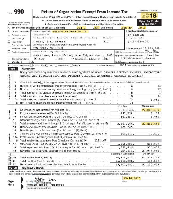 Raporda ayrıca, vakfa 2014-2018 yılları arasında toplam 56 milyon dolarlık hibe ve bağış yapıldığı tespit edildi. CHP ABD Temsilciliği, bu paranın New York'ta bir gökdelen inşaatı ve efsanevi boksör Muhammed Ali'nin Michigan'daki çiftliğini satın almak için kullanıldığını açıkladı.