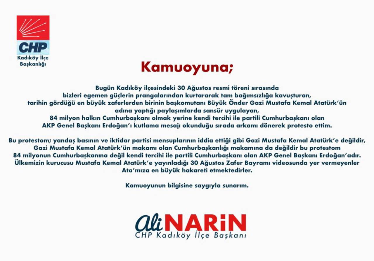 AKP Kadıköy İlçe Başkanı Fatih Kaya mesaj yayınlayarak bu hareketi kınamıştı. Kaya, "30 Ağustos Zafer Bayramı resmi töreninde Atatürk'e ve başkomutan Cumhurbaşkanımız Recep Tayyip Erdoğan'a saygısızca davranan Kadıköy Chp ilçe başkanı Ali Narin'i şiddetle kınıyorum" ifadelerini kullanmıştı.