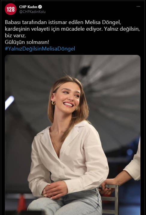 Sosyal medyada Döngel'e destek kampanyası başlatılırken, ünlü oyuncu için bir mesaj da CHP Kadın Kolları'ndan geldi. Cumhuriyet Halk Partisi Kadın Kolları Genel Başkanlığı resmi Twitter hesabından yapılan paylaşımda, "Babası tarafından istismar edilen Melisa Döngel, kardeşinin velayeti için mücadele ediyor. Yalnız değilsin, biz varız. Gülüşün solmasın!" ifadelerine yer verildi.