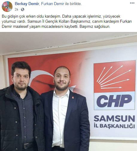 Berkay Demir, "Bu gidişin çok erken oldu kardeşim. Daha yapacak işlerimiz, yürüyecek yolumuz vardı. Samsun İl Gençlik Kolları Başkanımız, canım kardeşim Furkan Demir maalesef yaşam mücadelesini kaybetti. Başımız sağolsun." ifadelerini kullandı.