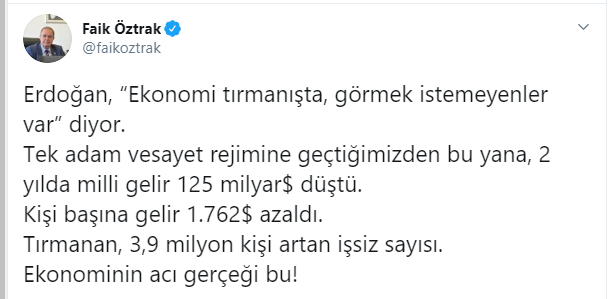 Erdoğan, “Ekonomi tırmanışta, görmek istemeyenler var” diyor. Tek adam vesayet rejimine geçtiğimizden bu yana, 2 yılda milli gelir 125 milyar$ düştü. Kişi başına gelir 1.762$ azaldı. Tırmanan, 3,9 milyon kişi artan işsiz sayısı. Ekonominin acı gerçeği bu!