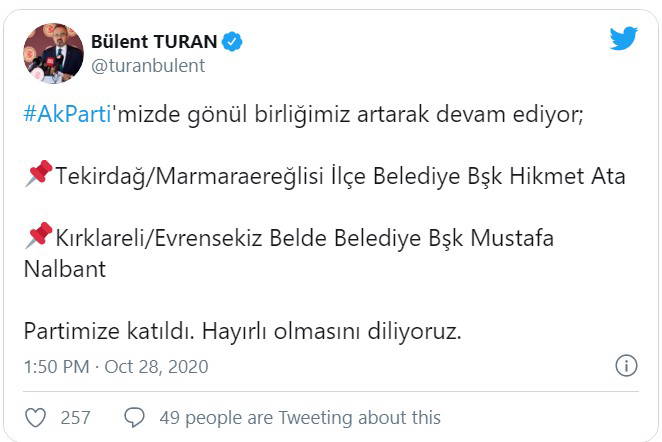 Söz konusu katılımları, AKP Meclis Grup Başkanvekili Bülent Turan Twitter hesabından duyurdu. Turan’ın paylaştığı mesaj şöyle: