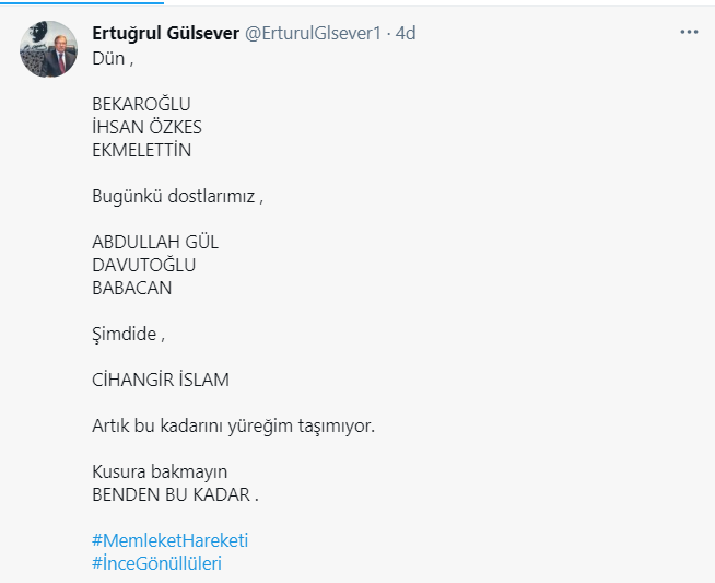 Saadet Partisi'nden geçen yılın mart ayında istifa eden Cihangir İslam dün CHP'ye katılmıştı. Gülsever, "Artık bu kadarını yüreğim taşımıyor. Kusura bakmayın" ifadeleriyle tepkisini dile getirdi. Gülsever, Muharrem İnce’nin başlattığı Memleket Hareketi’ne katıldığını duyurdu.
