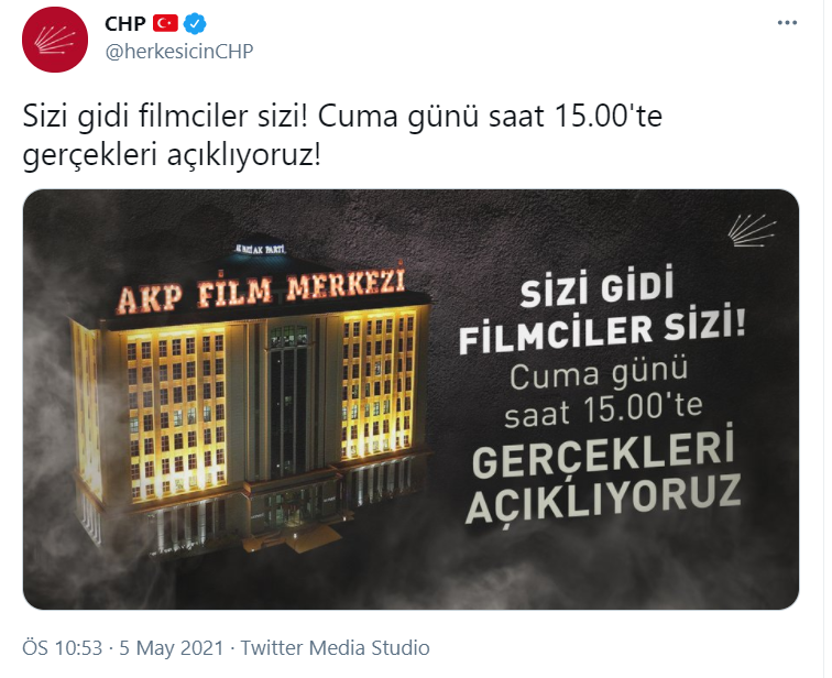 AKP’nin resmî Twitter hesabından yapılan “Yarın saat 14.00'te" paylaşımın ardından CHP'yle ilgili animasyon filmi çıkmasına CHP'den yanıt geldi. Hesaptan yapılan paylaşım şöyle oldu: