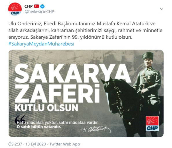 Cumhuriyet Halk Partisi, Sakarya Zaferi'nin 99. yıl dönümü nedeniyle bir mesaj yayınladı.