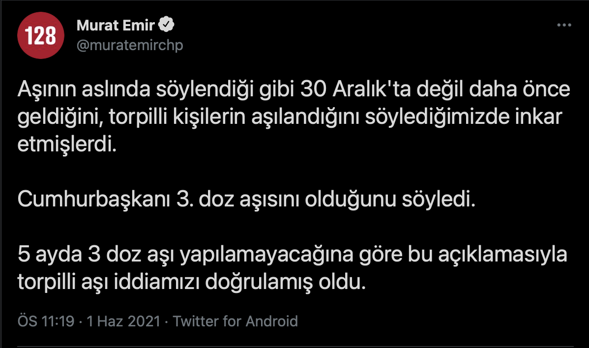 CHP'li Emir, Twitter hesabı üzerinden, "Aşının aslında söylendiği gibi 30 Aralık'ta değil daha önce geldiğini, torpilli kişilerin aşılandığını söylediğimizde inkar etmişlerdi. Cumhurbaşkanı 3. doz aşısını olduğunu söyledi. 5 ayda 3 doz aşı yapılamayacağına göre bu açıklamasıyla torpilli aşı iddiamızı doğrulamış oldu" sözleriyle tepki gösterdi.