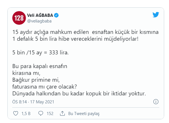 15 aydır açlığa mahkum edilen esnaftan küçük bir kısmına 1 defalık 5 bin lira hibe vereceklerini müjdeliyorlar! 5 bin /15 ay = 333 lira. Bu para kapalı esnafın kirasına mı, Bağkur primine mi, faturasına mı çare olacak? Dünyada halkından bu kadar kopuk bir iktidar yoktur" dedi.